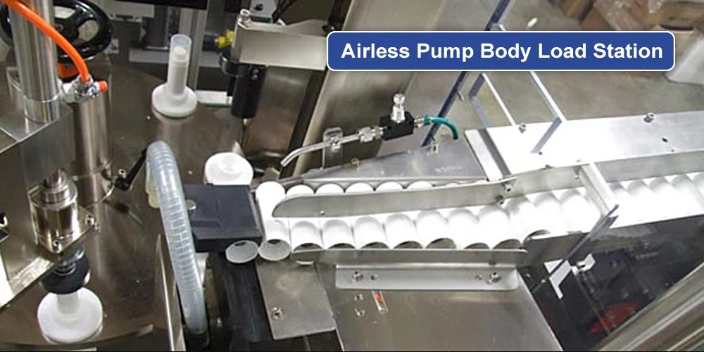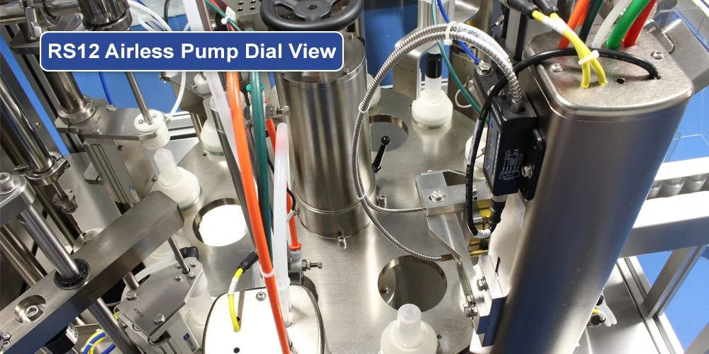The RS12 Automatic Airless Pump Filler with speeds to 55 airless pumps per minute has a 12 station dial which allows for additional post filling options perfect for cosmetic and pharmaceutical markets.