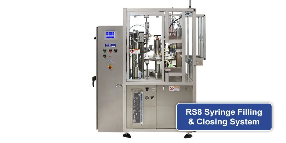 The RS8 rotary syringe filler with speeds to 35 syringes per minute has a compact 8 station dial and will fill and close a variety of syringe styles.